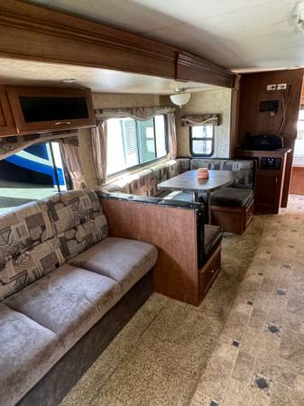 Box is 26.5ft long Electric slide out, electric awning, and electric hitch Has AC, heater, boiler, drainage system, gas stove/oven, microwave, queen bed, lots of storage space
